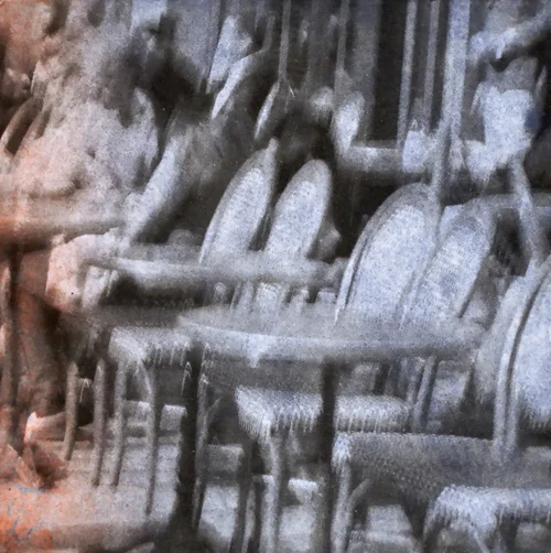 This series depicts figures passing, empty chairs still holding the energies of those that came before. The mood is both mysterious and hopeful.